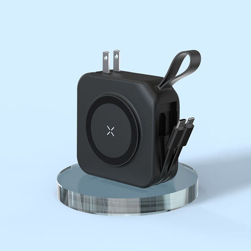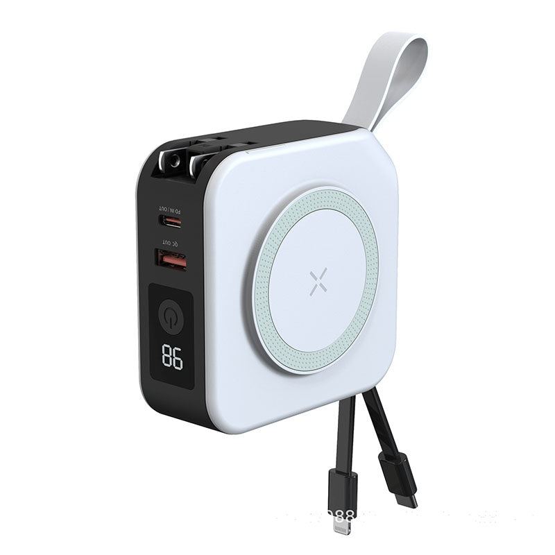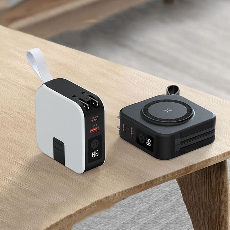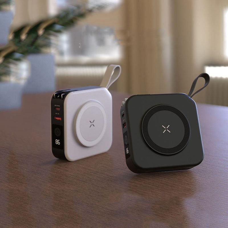 モバイル電源、充電器、磁気ワイヤレス充電器、電話スタンドとして機能し、C ラインを内蔵した多目的ソリューションです。