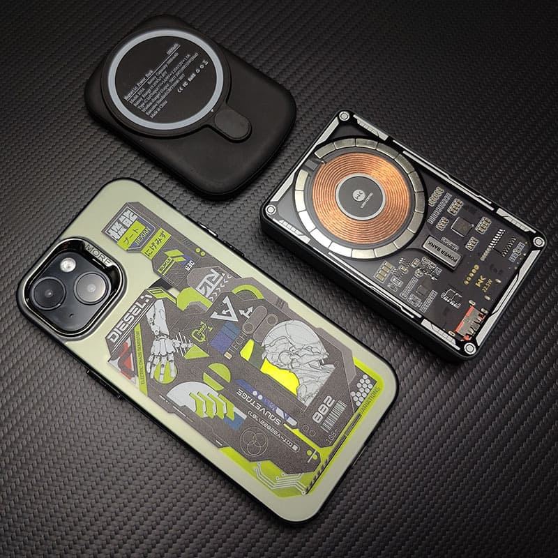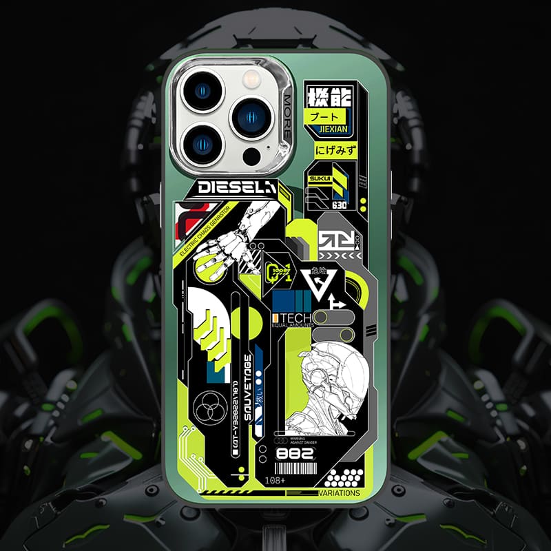 目を引く機械戦士のデザインを特徴とする、Magsafe 対応の磁気電話ケースとスタンド セットの洗練された未来的な美学を堪能してください。