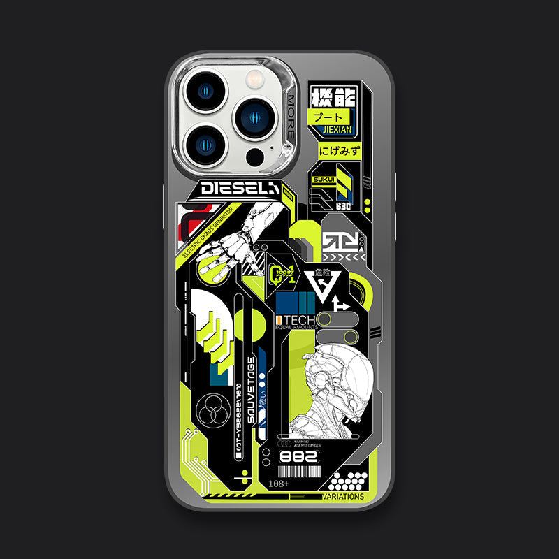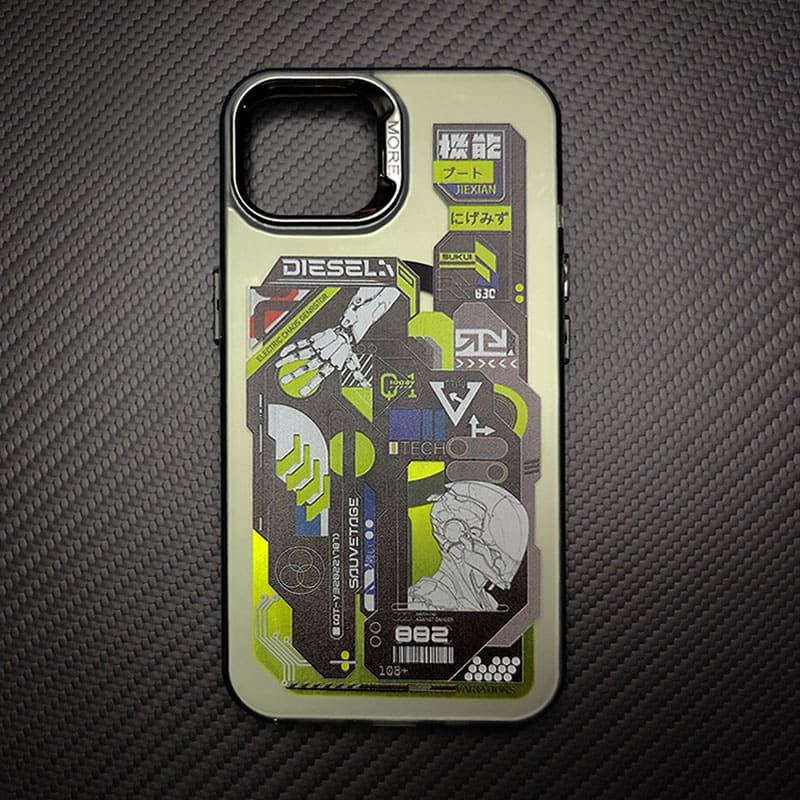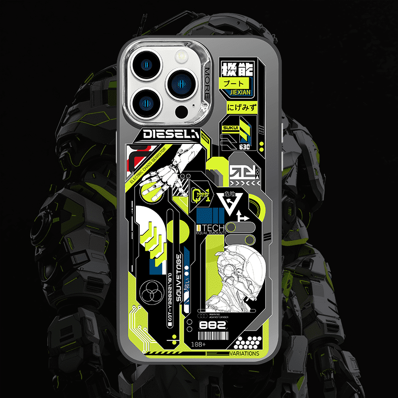 目を引く機械戦士のデザインを特徴とする、Magsafe 対応の磁気電話ケースとスタンド セットの洗練された未来的な美学を堪能してください。